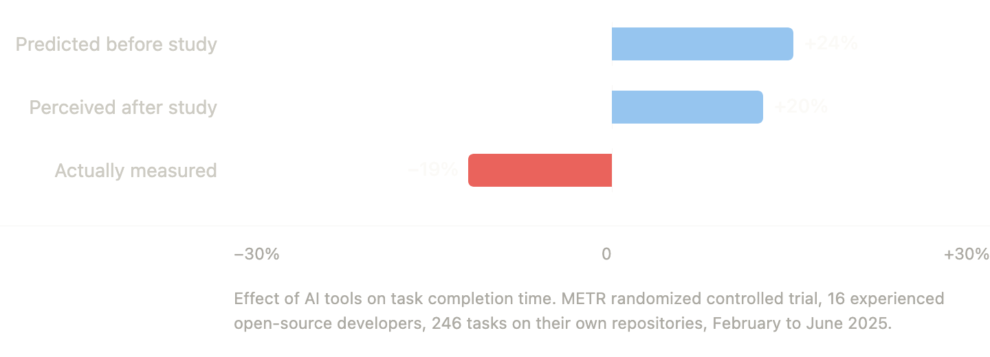 The pessimistic counterpoint comes from METR, a nonprofit that ran a randomized controlled trial with 16 experienced open-source developers in mid-2025. The developers predicted AI tools would speed them up by 24%, then after the study reported feeling 20% faster, when in fact they were 19% slower. The gap between perception and reality was the striking finding, and it replicated. METR has since acknowledged selection effects in the original study design and updated their estimate for 2026 to something closer to a 4% slowdown, well within the noise, but the robust finding is the perception gap itself. People consistently believe AI is helping them considerably more than the measurements show.