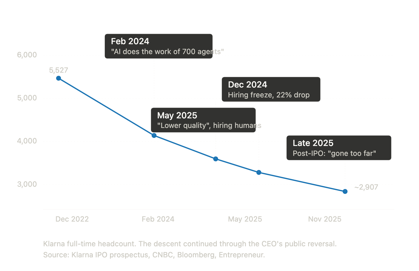 - "Klarna CEO admits aggressive AI job cuts went too far, starts hiring again after US IPO." MLQ.ai News, October 10, 2025. https://mlq.ai/news/klarna-ceo-admits-aggressive-ai-job-cuts-went-too-far-starts-hiring-again-after-us-ipo/