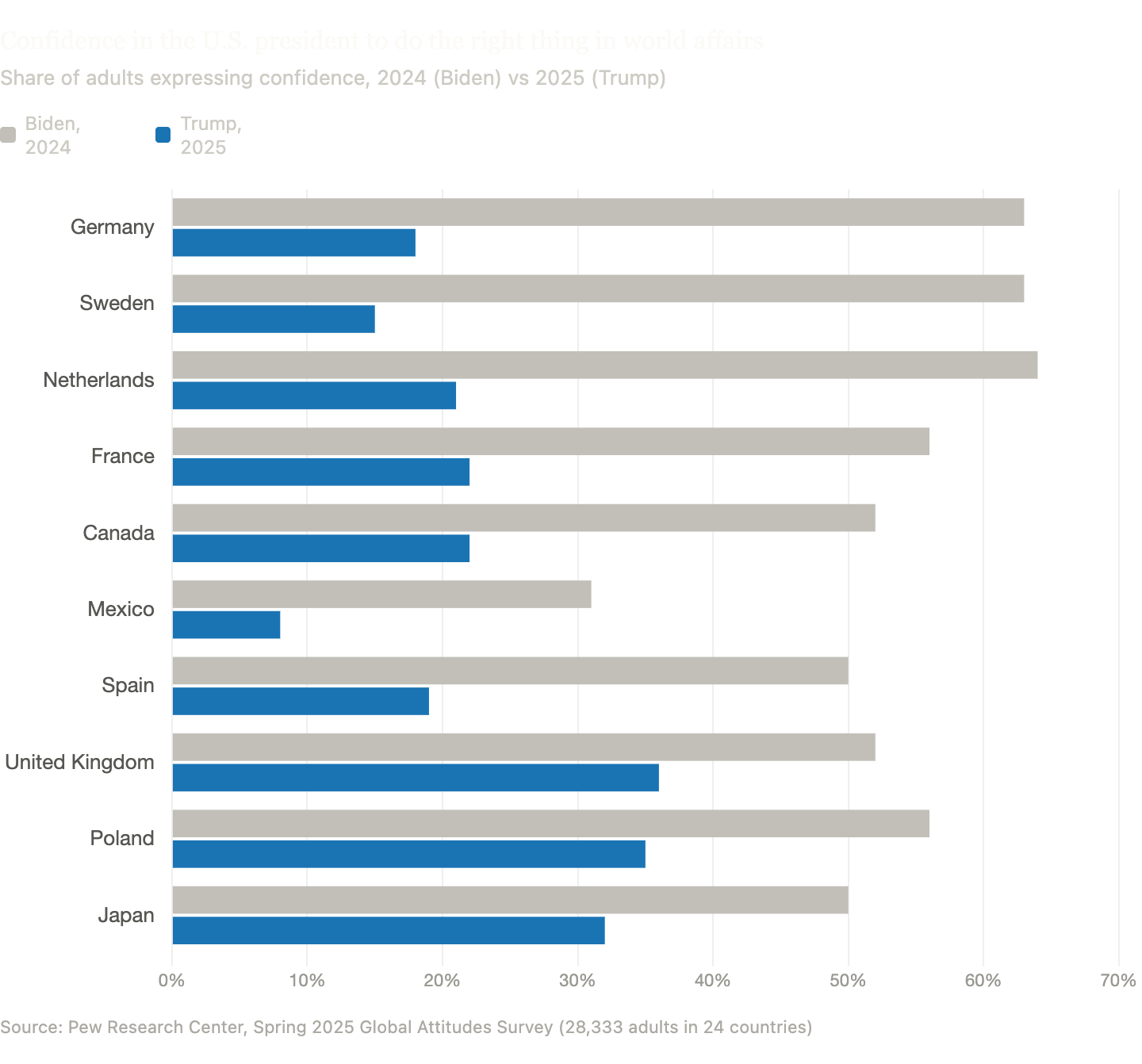Pew Research Center, "U.S. Image Declines in Many Nations Amid Low Confidence in Trump," June 11, 2025, on the 24-country survey and the Biden-to-Trump confidence shifts in Germany and Sweden.