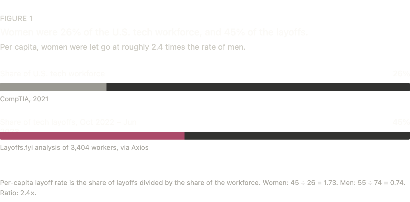Tech was cutting women at a disproportionate rate well before an AI dashboard entered a performance review. Between October 2022 and June 2023, a Layoffs.fyi analysis of 3,404 workers reported by Axios found women took 45% of the cuts. Revelio Labs, running different data over September to December 2022, came in at 47%. Women are around 25 to 26% of the U.S. tech workforce per CompTIA, which means their share of the layoff pile was close to double their share of the desks, and on a per-capita basis they were being let go at roughly two and a half times the rate men were. Most of this analysis infers gender from names, so treat the numbers as directional, but every serious cut of the data says the gap is real and large.