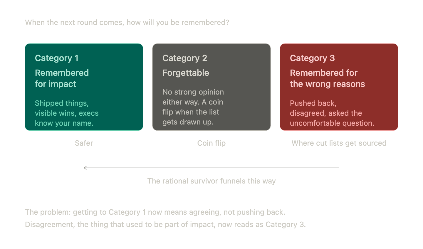Post-layoff, the math on pushback changes, and it changes in a direction that is obvious the moment you write it down. If you push back and you are right, you get some quiet credit from the people who noticed, and quiet credit is a currency that doesn't really spend anywhere. If you push back and the exec takes it personally, you have just moved yourself from category one to category three, and category three is where cut lists get sourced. The upside is a pat on the back in a one-on-one. The downside is your name on a slide in a meeting you will never be invited to.